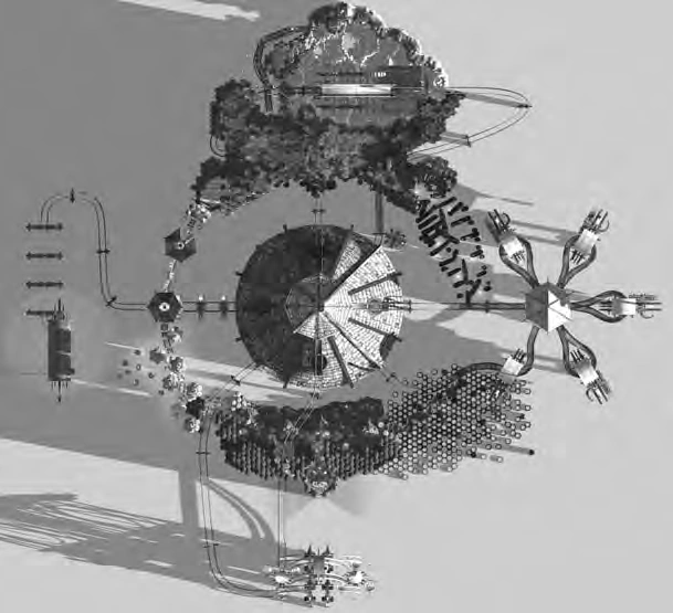 4 structures dominate each compass point of the complex, around a huge pagoda that occupies the center of the island. All are traversed by elevated twisting and turning tracks that come from and end back to the towering pagoda.