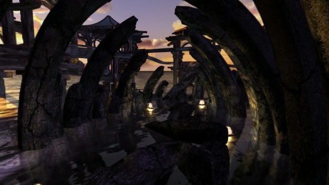 To the south is a field of hexagonal pools and moss-covered columns; a wooden path traverses aong a series of columns veined by glowing crystaline formations, and a wooden ladder leading back to the link-in point pagoda.