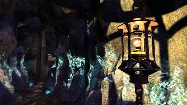 Towering basalt columns to the north form a tunnel with hexagonal steps and glowing crystal fragments; Atrus had put a chain-link guardrail there, as well as Fire Marble lanterns carved into the columns complementing the natural light. A left fork leads to a wooden walkway and to the Balance Bridge standing above mineral deposits and a honeycomb of glowing, geyser-formed paint pots; the right fork passes by an elevator shaft carved into the basalt, and a tunnel lit by glowing blue crystals ending up to Saavedro's Cave and a series of crumbling basalt columns.