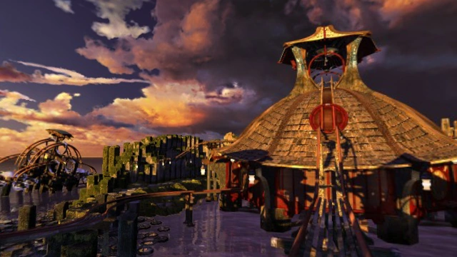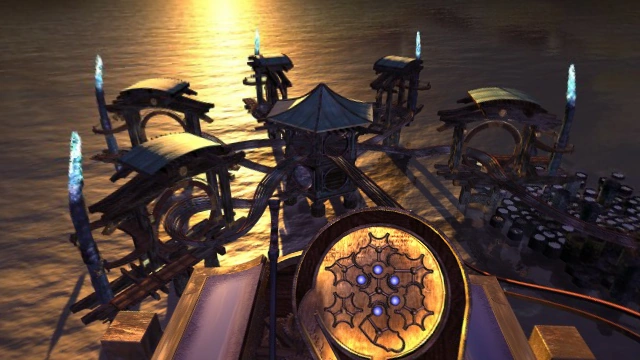The wooden walkway west of the Central Tower. The link-in point to the Age is a small wooden pagoda just beyond the Offshore Structure. A wooden path leads to the Central Tower but with gaps. 3 podiums with hexagonal code boxes stand out with stone hexagonal buttons to enter the special pattern that is revealed each time one of the 3 puzzles is solved, so that the gaps are closed with a trap door. (For safety reasons, the mechanism works only if the puzzles have been solved)
