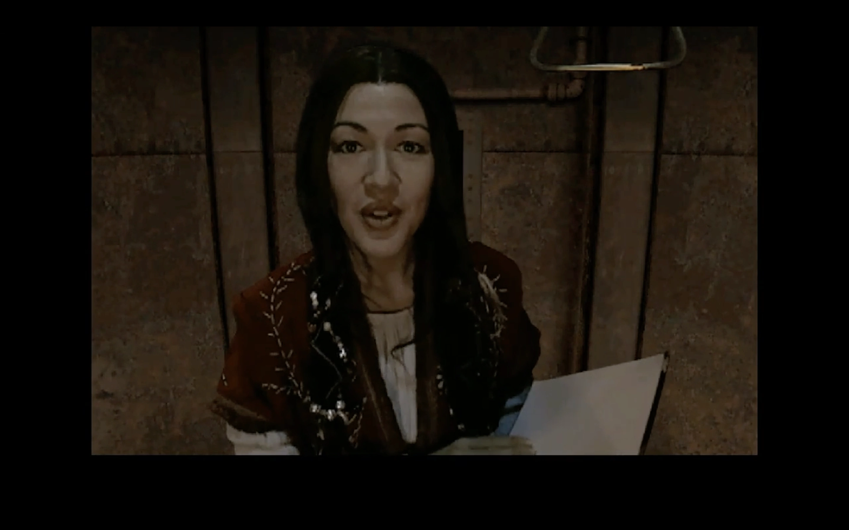 When she linked to Riven she found an unrecognisable environment, other than the air. Right afterwards, she was trapped in the cage, and was hit with a dart. As she was drugged, a Rivenese man wearing D'ni dress (Gehn's Guard) came to her to capture her. He claimed that she had no Linking Book in her belongings. However she was rescued by the Moiety during one of their sorties.[8][2]
