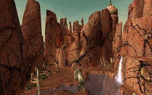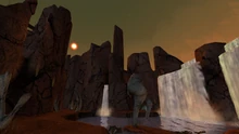 Eder Gira is a volcanic scrap of land, dotted with steam vents (some of which seem to be used as an energy source of some kind) and a very out-of-place waterfall. A number of awkward bone structures dot the landscape, and a series of inter-connected dark passageways run through the back ridge, behind the waterfall. Small, manta-ray-like creatures can be found swimming in the pond below the falls, and baskets arrayed around the caves in the rear of the Age indicate that at one time this Age may have featured fishing as a distraction from everyday life in the Cavern. The focus of this Age is the linking book to its sister, Eder Kemo.