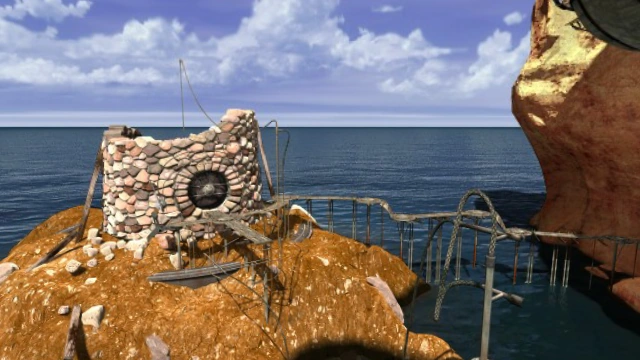A tiny islet sitting at the mouth of the inlet. It is the link-in point to the Age, and a round stone building stands on it. metallic container protects a linking book to the Energy Tusk of J'nanin should the learners wish to return before having finished the trial. The building is connected with a thick electrical cable which runs through a metal pole and protrudes from the water. Initially it is unpowered and its metallic security door won't open, but behind it, there is a small stone room with a ladder down a long shaft. Another metal door covers the Electromagnet Chamber below.