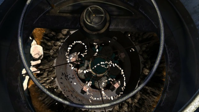 An underground chamber where the blue-lit tunnel leads. Its purpose is to control and provide superheated air from the lava heat, needed to inflate the airship. The chamber has two levels. Each has a control wheel with a red knob which activates the control gear, or moves its hydraulic arm, in the containment room.