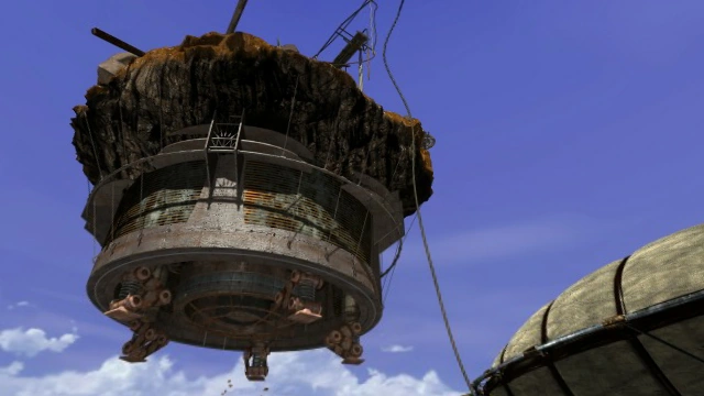 Movement around the island is possible with suspended catwalks and walkways, bridges and ladders. Most structures seem to be suspended from other structures and wires protruding from the rock walls.