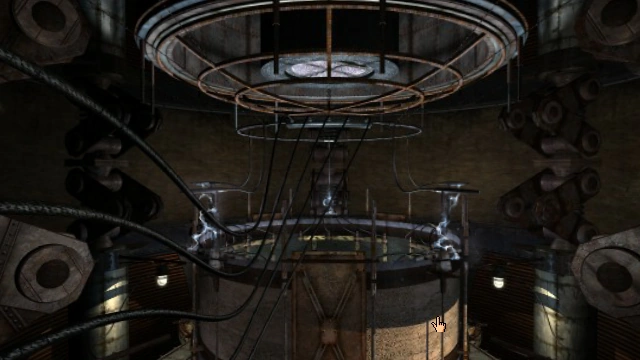The main chamber has a central electromagnet cylinder (probably the Lower Magnet) surrounded by 5 platforms and electromagnetic coils line its walls. The cylinder is powered by the Waterwheel's turbine generator and distributes power to other locations (such the Chasm Elevator and the Small Isle). It houses a vast electrical circuit array ringed along the interior walls. Apertures in the cylinder, numbered in D'ni counterclockwise, show segments of the 3 movable strips of circuits, allowing to align their connectors. When it operates, electricity arcs from the central circuit to the coils.